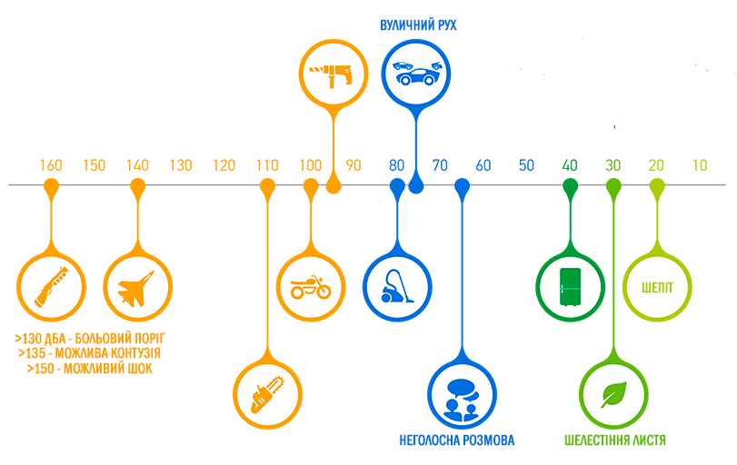 Надмірний вплив звуків рівнем понад 85 дБ може викликати пошкодження слуху, якщо перебувати в ньому більше 4 годин. Шум гучністю в межах 110 дБ (шум вертольота), людське вухо може без шкоди переносити лише кілька хвилин. Звук у 130 децибелів вже викликає у людини больове відчуття у першу хвилину, а у 150 дБ стає для нього нестерпним.