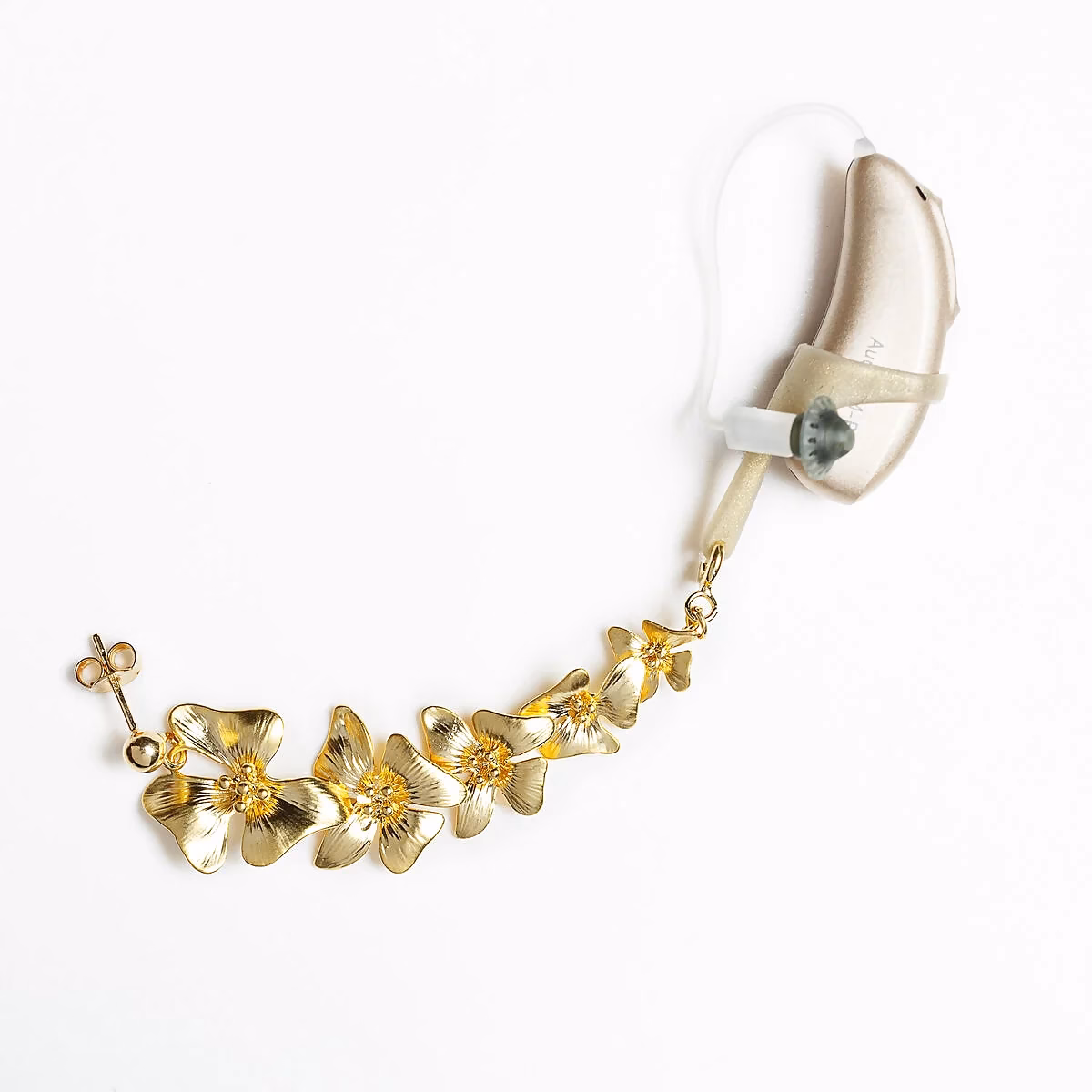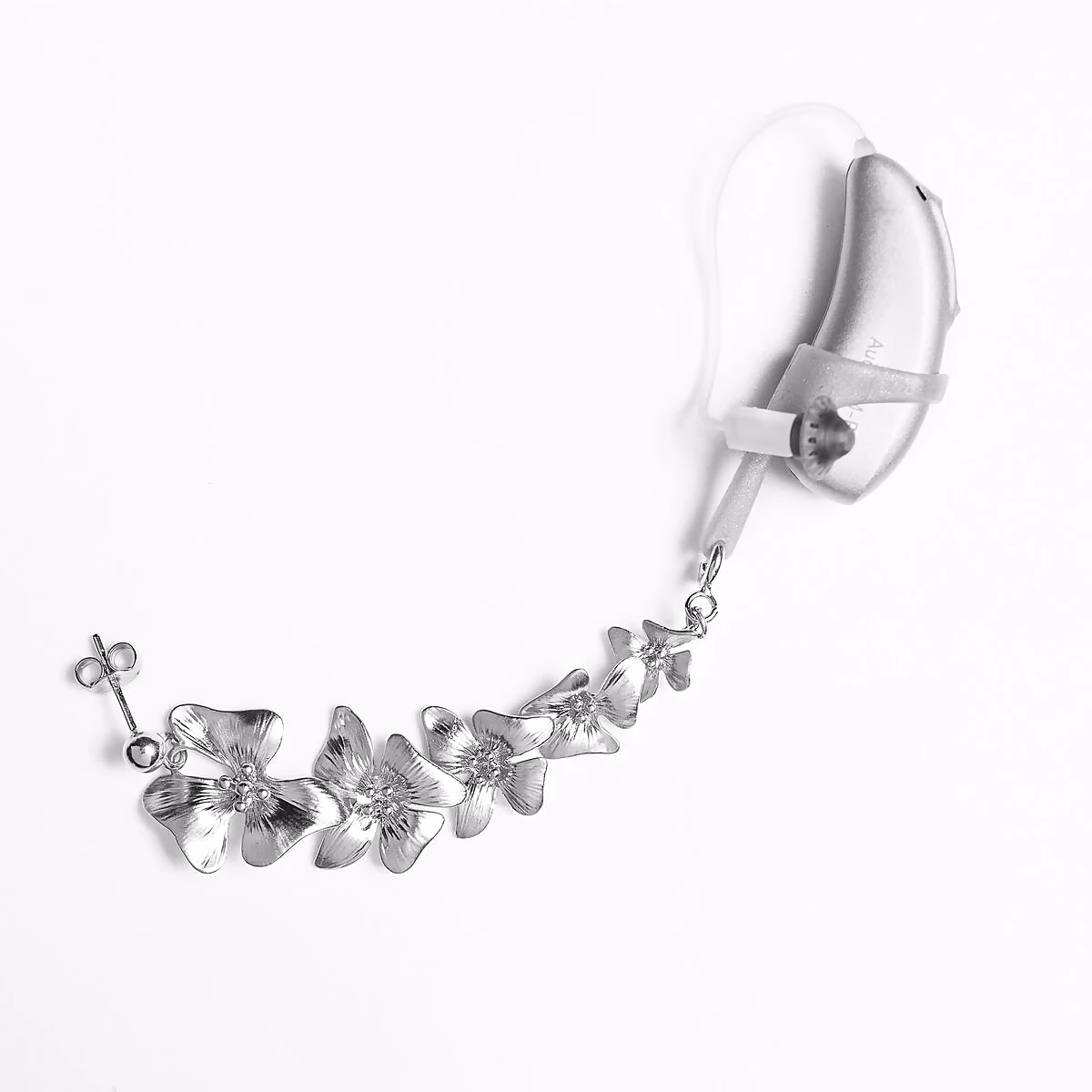 Тримач Orkidea Deafmetal — це елегантний арт-тримач з прикрасою у формі каскаду ніжних орхідей, які простягаються від сережки-гвоздика до тримача, який кріпиться до слухового апарату або процесору кохлеарного імплантата. Витончений дизайн поєднує срібну сережку-гвоздик, декоративний ланцюжок з мережки квітучих орхідей в зотому чи срібному кольорі на вибір та силіконовий тримач, що кріпиться до пристрою, перетворюючі всю композицію на стильний аксесуар.