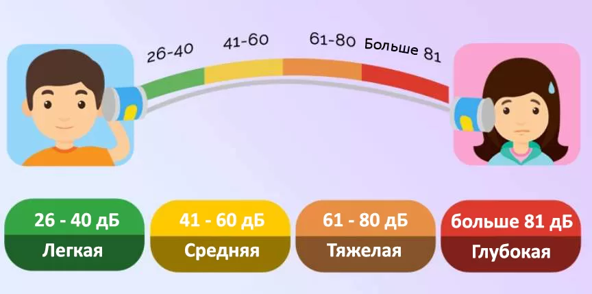 Уровень снижения слуха обычно классифицируют как легкий, средний, тяжелый или глубокий. Предельные значения степени потери слуха несколько отличаются по данным разных аудиологов, но они примерно такие, как показано на графике ниже.