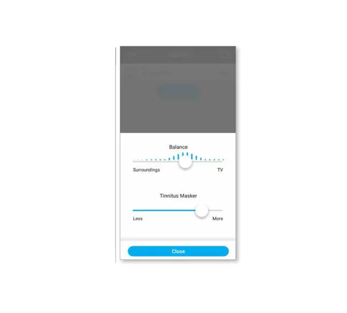 Доступны дополнительные настройки в зависимости от конфигурации слухового аппарата, или подключенных источников звука (TV Connector). Нажмите кнопку в правом нижнем углу, чтобы получить доступ к таким параметрам балансировки звука и функции Тинитус Маскер.