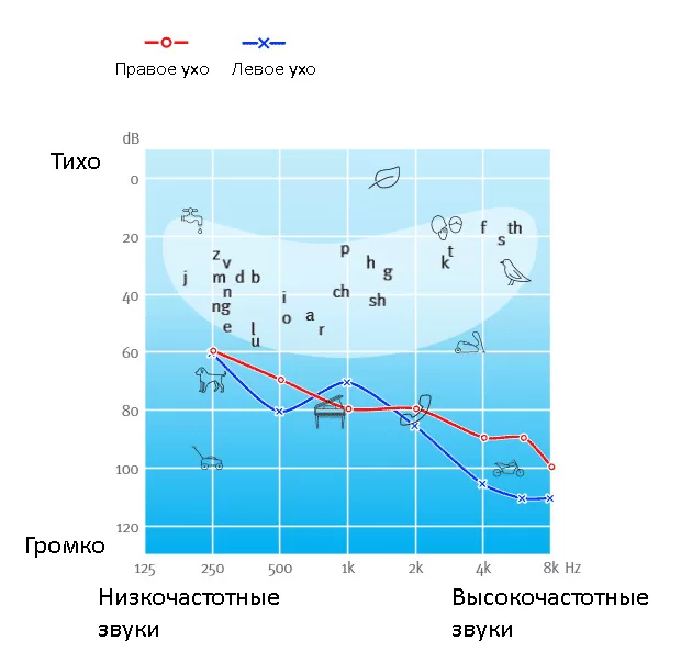 На рисунке приведен пример, который показывает чувствительность индивида к определенному диапазону частот, а также демонстрирует речевые звуки и другие привычные звуки окружающей среды на их приблизительных уровнях.