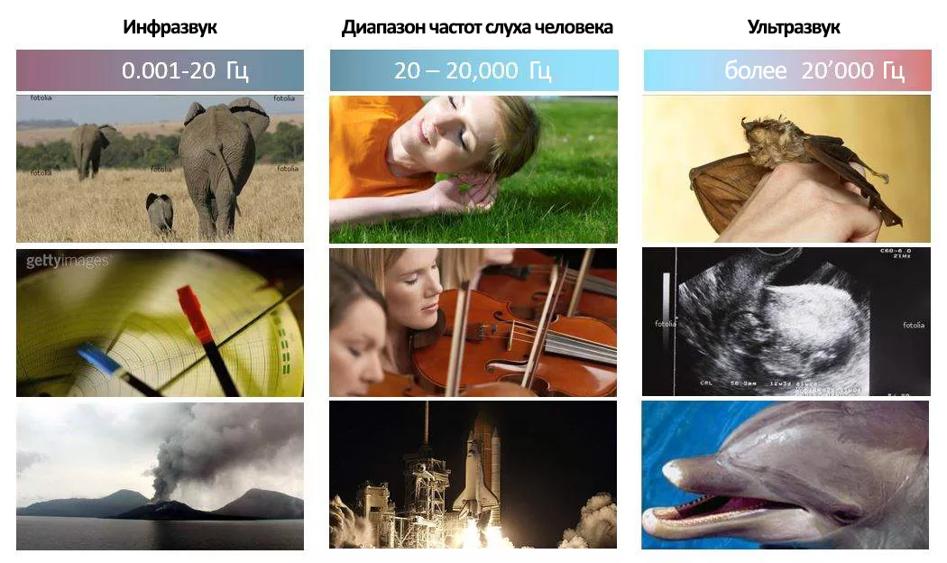 На картинке представлен диапазоны частот. В центральной колонке Вы видите диапазоны частот слуха человека. Некоторые животные, например, слоны и киты могут слышать звуки намного ниже по частоте (инфразвук), а другие — летучие мыши, собаки и дельфины, звуки гораздо выше частотой (ультразвук), чем люди.