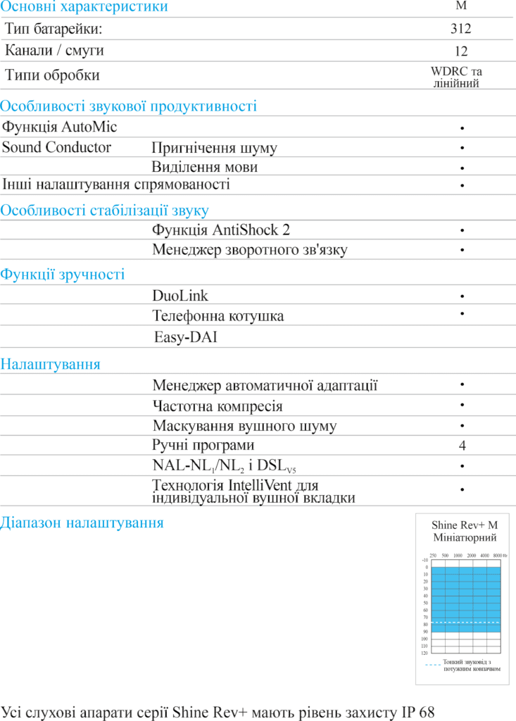 Майже непомітні мініатюрні завушні слухові апарати Shine Rev+M виконані у стильному корпусі. Вони поєднують у собі стиль і зручність від використання тонкої трубки, а також потужність та покращену функціональність: